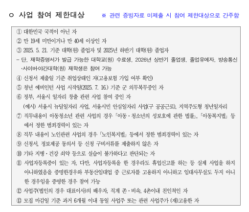 지원대상은 대학교 재/휴학중인 만 19세~39세 청년입니다. 주민등록 상 서울에 거주중이거나 서울소재 대학(원)에 재/휴학중인 자를 대상으로 합니다. 사업 참여 제한 대상도 있으니 지원 전 확인해보시기 바랍니다.