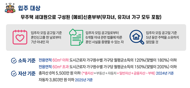 - 무주택 세대원으로 구성된 (예비)신혼부부(무자녀/유자녀 모두 가능), 신혼부부는 혼인신고를 한 날로부터 7년 이내임.